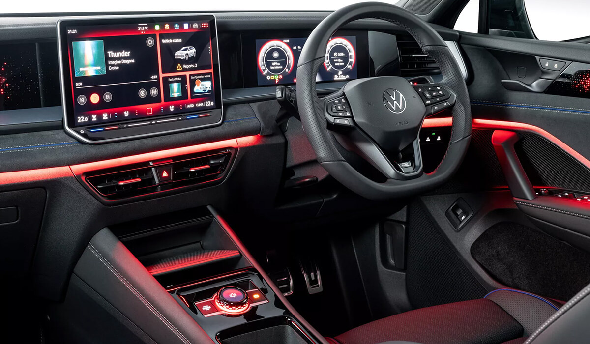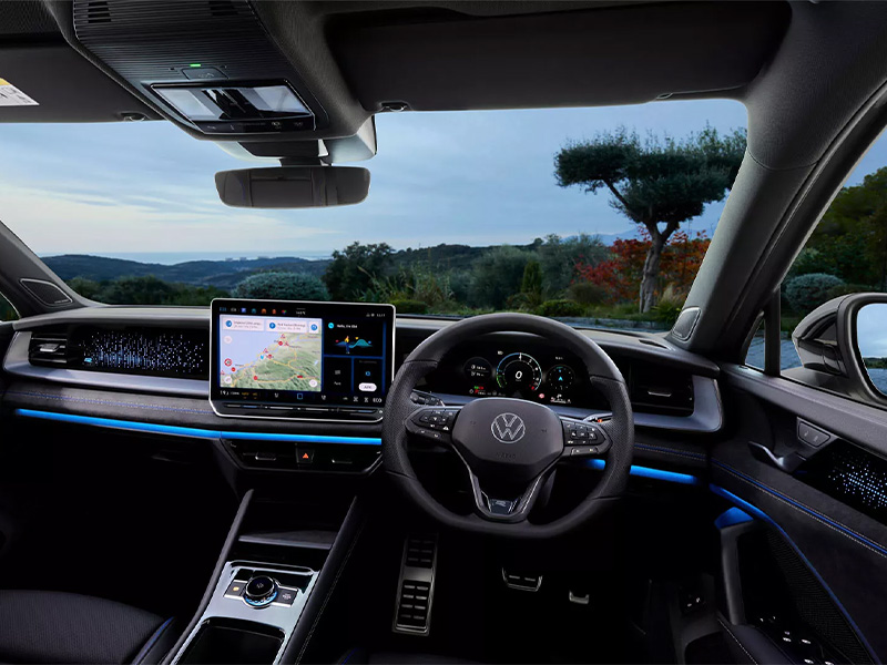 Engineered in Wolfsburg and created for a global audience, the new Tayron expands Volkswagen’s SUV line-up with confidence. Its sporty character is evident in every detail – from the bold front design and body-coloured door panels to the choice of four optional 20-inch alloy wheel designs. Standard features such as ambient lighting, illuminated VW emblems at the front and rear, updated high-beam headlights, and redesigned tail lights with dynamic indicators give the Tayron a distinctive presence. For those who want even more, the optional IQ.LIGHT HD matrix headlights provide an advanced lighting experience.
