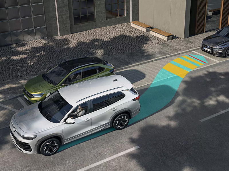 IQ.DRIVE represents advanced driver assistance engineered for reliability, precision, and peace of mind. Standard assist systems include adaptive cruise control (ACC), lane change system (Side Assist), lane keeping system (Lane Assist), an automatic emergency braking system with pedestrian and cyclist monitoring (Front Assist), Park Assist Plus, a rear-view camera system. Additionally, the Tayron comes with a new exit warning system, which can prevent a door from being opened if a vehicle approaches from behind, offering both acoustic and visual warnings.